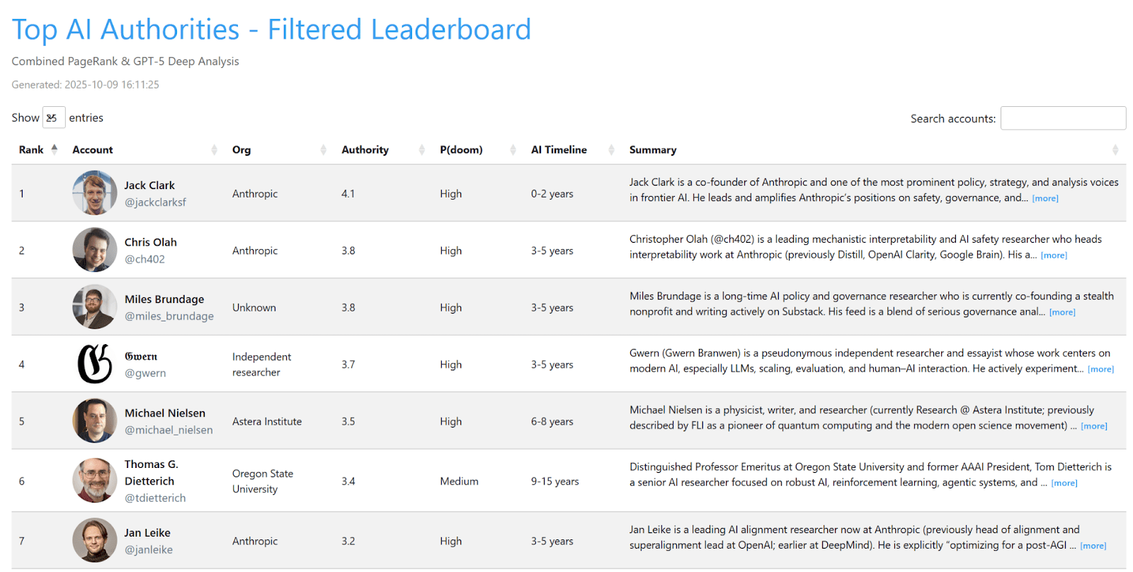 I also had AI analyze their tweets and web search to try and link the user to an org, find their rough P(doom), give a rough AI timeline estimate, and a summary.