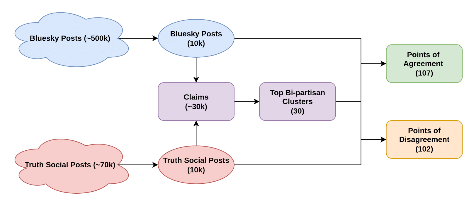 I downloaded ~500k posts from Bluesky and Matt scraped ~70k from Truth Social (based on AI-related keywords), and then I filtered down to posts actually discussing AI as a technology. The Truth Social dataset was significantly smaller with less engagement, so I have less confidence in those results.