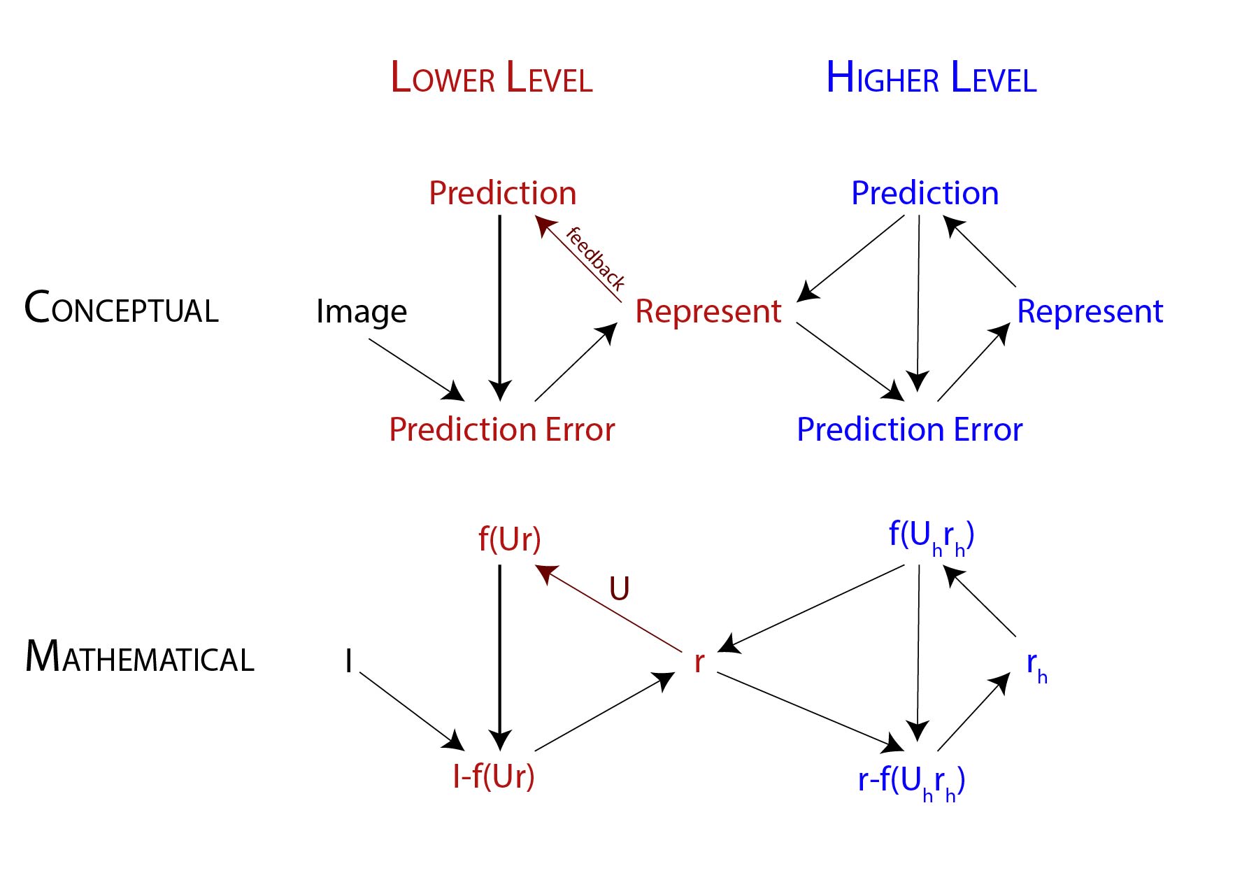 This is an overview of the classic 1999 paper by Rajesh Rao and David Ballard that introduced predictive coding. I'm going to focus on explaining the mathematical setup instead of just staying at a conceptual level. I'll do this in a series of steps of increasing detail and handholding, so that you can grasp the concepts by reading quickly, assuming you are familiar with the mathematical concepts. In addition I have implemented a convnet version of this framework in pytorch, which you can look at in this notebook: