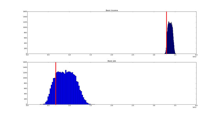 Some time ago, I discovered a post comparing basic income and basic job ideas. This sought to analyse the costs of paying everyone a guaranteed income versus providing them with a basic job with that income. The author spelt out his assumptions and put together a two models with a few components (including some whose values were drawn from various probability distributions). Then he ran a Monte Carlo simulation to get a distribution of costs for either policy.