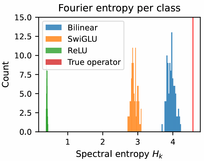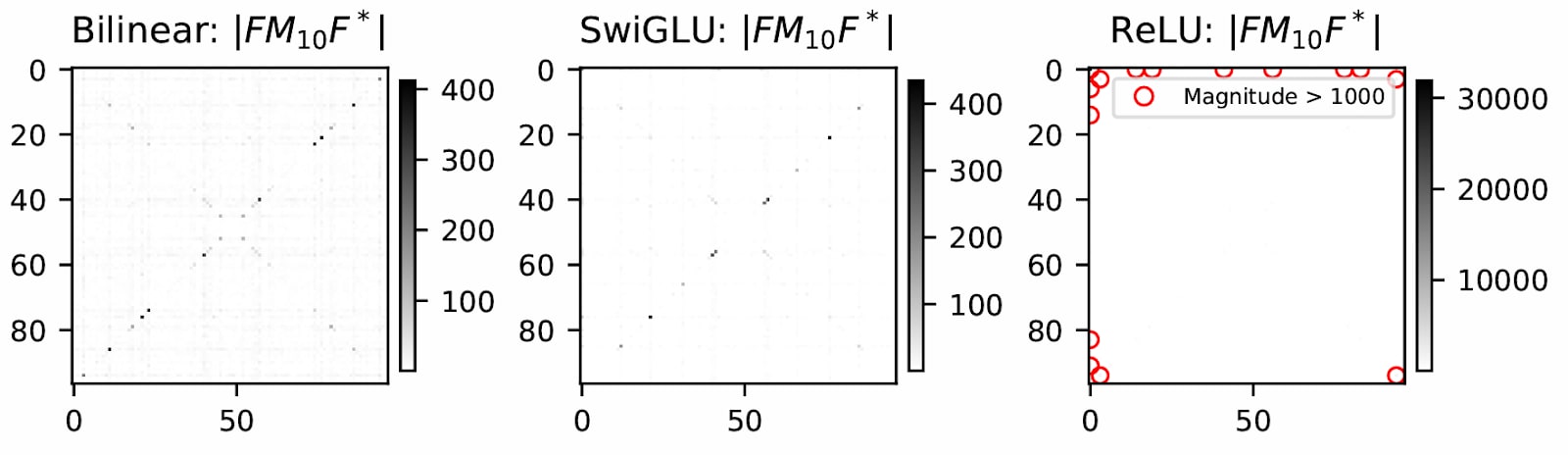 The bilinear one has a diagonal band, ReLU is mostly white with a few bright spots (marked in red), and SwiGLU lies somewhere in betweenHere are the entropy numbers: ground truth is 4.57, bilinear gets 4.33, SwiGLU gets 2.87, and ReLU gets 0.37.