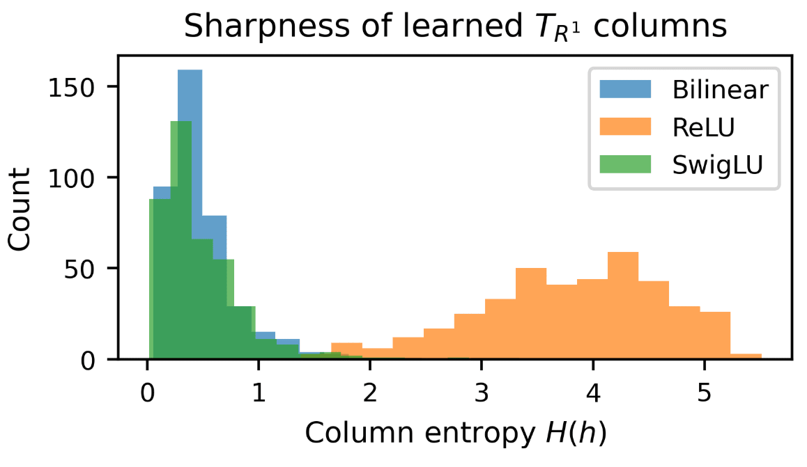 The bilinear model's T has very sharp columns. Each column is nearly one-hot, with almost all probability mass on a single tail. Column entropy averages 0.74 (a perfect permutation would be 0, a uniform distribution would be ~6). The ReLU model's columns are diffuse, entropy 4.89, and almost uniform. SwiGLU's T has more focused columns than ReLU, but not as sharp as bilinear. Column entropy averages 1.09; you can see a peak in each column, but with more spread than bilinear's near one-hot structure.