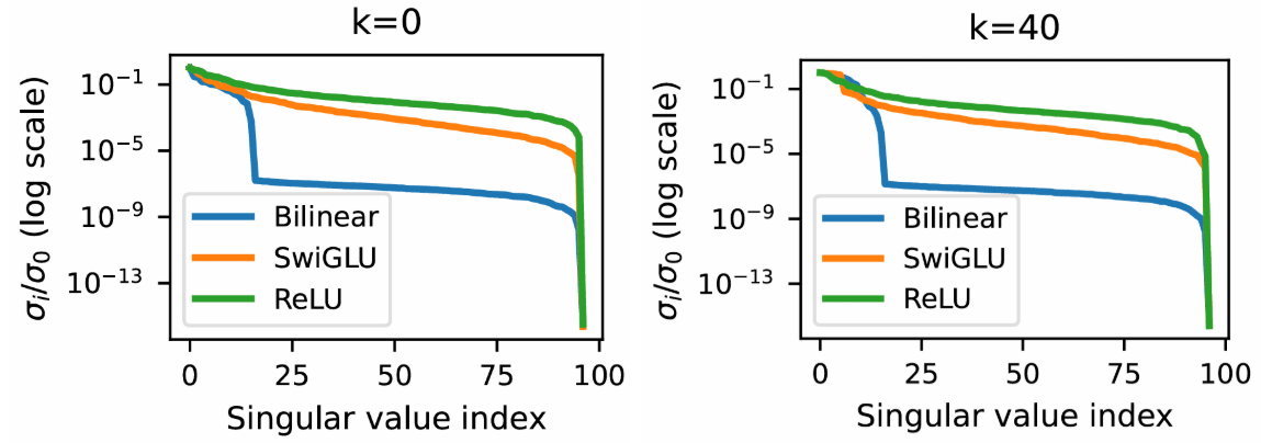 The bilinear spectra drop off sharply. I examined the normalized spectrum, plotted on a log scale, for two representative classes (Figure 3). In the bilinear model, the spectra decay steeply: a small number of singular values account for most of the variance, and the tail drops rapidly. In the ReLU model, the spectra are noticeably flatter: the singular values decrease more slowly, and the tail remains substantial. Here, SwiGLU performs like ReLU, and is only slightly better.