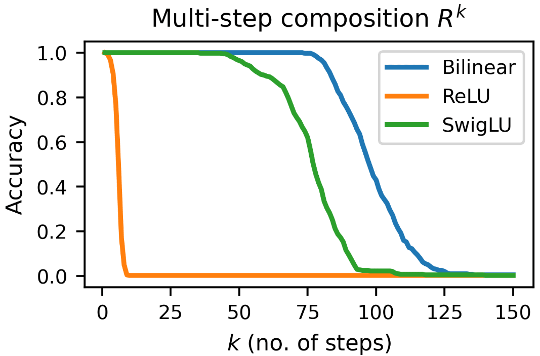 SwiGLU: Maintained perfect accuracy up to k≈50 steps, then dropped slowly.