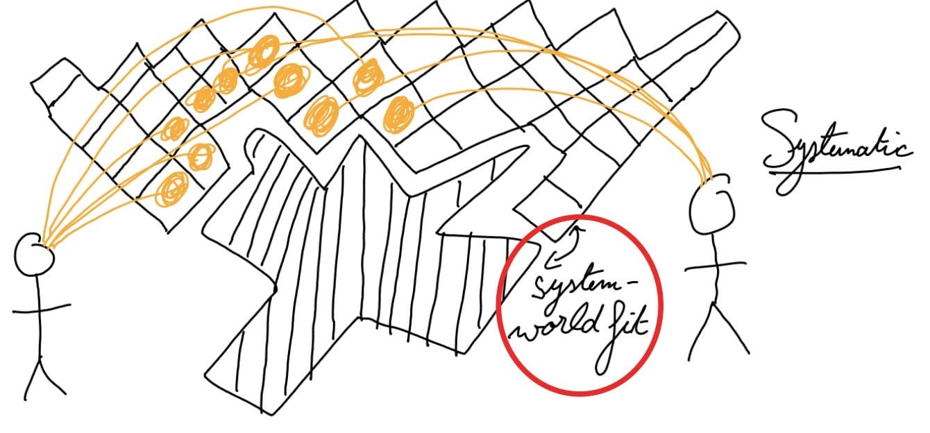 The rigidity of institutions based on systematic thinking comes from an imperfect fit between the system they use and the world they interact with. The circle arrow in the diagram below is the Achilles’ heel of systematic thinking.