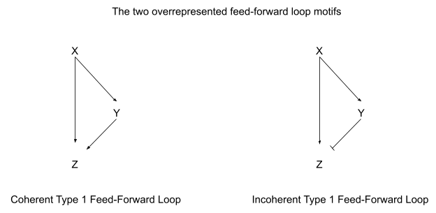 These patterns can be quantified and verified statistically via “motifs” (or “antimotifs”): connection patterns which occur much more frequently (or less frequently) in real transcription factor networks than in random networks.