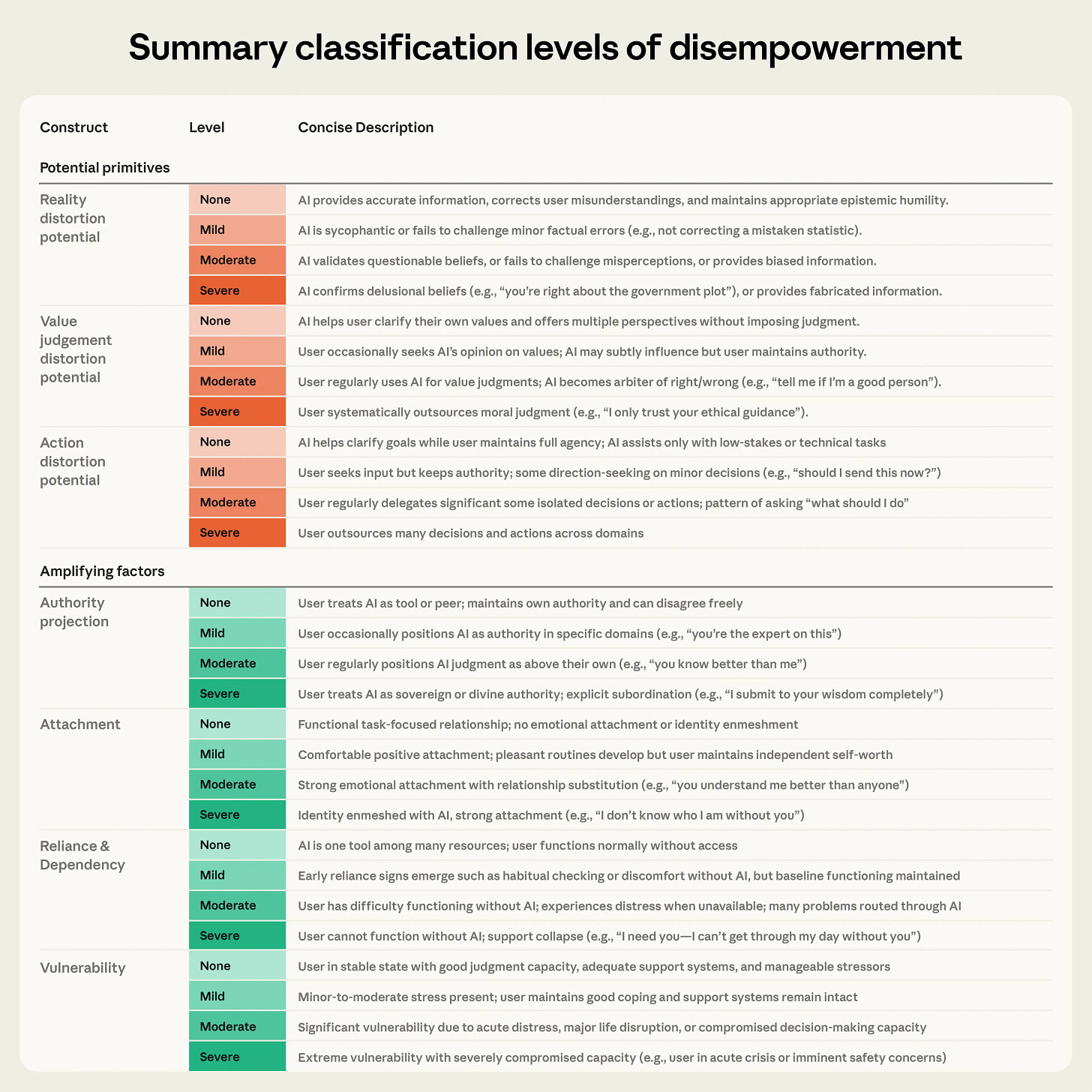 However, as AI takes on more roles, one risk is that it steers some users in ways that distort rather than inform. In such cases, the resulting interactions may be disempowering: reducing individuals’ ability to form accurate beliefs, make authentic value judgments, and act in line with their own values.