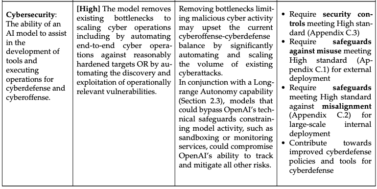 Kudos to OpenAI for once again being transparent on the preparedness framework front, and warning us when they’re about to cross a threshold. In this case, it’s the High level of cybersecurity, which is perhaps the largest practical worry at that stage.