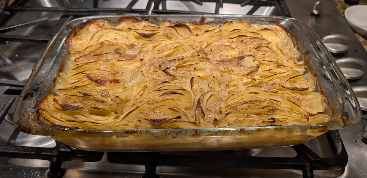 As another variation, I wonder how it'd come out if you used a sheet pan instead of a baking dish. I'd think that you'd get more crispy bits because of the increase in surface area of potato that is exposed to heat. Personally I'm a big fan of those crispy bits!