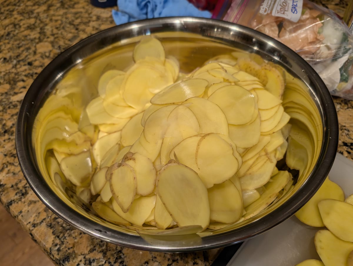 2. Peel the potatoes and then slice them thinly with a mandoline (I use the 2mm setting on mine). Cut any leftover potato pieces into thin strips. Add all of the potato to a very large bowl.