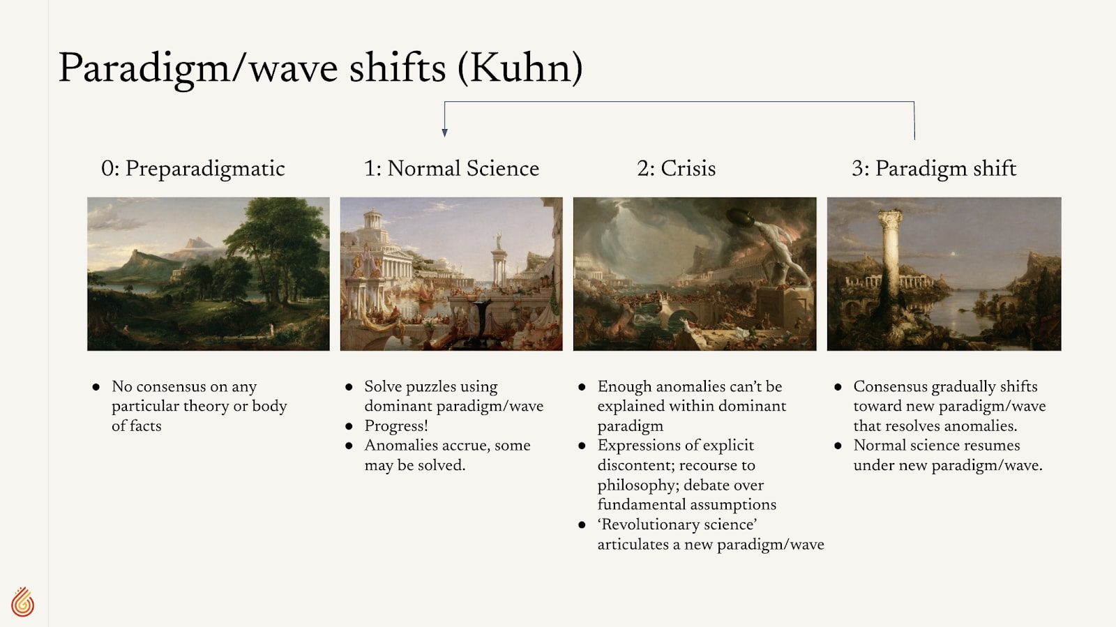 In addition to this model, I contend that there are mini paradigms that are local to scientific subfields. These mini paradigms can undergo mini paradigm shifts, even when the field as a whole remains within roughly the same paradigm. One way I think about 'normal science' is that it actually constitutes a number of smaller paradigm shifts that occur within a larger paradigm. I'll call these mini paradigms "waves", but they have essentially the same properties as paradigms do: They're a set of concepts, methods, standards for what constitute legitimate contributions to a field, etc. We'll study each wave/mini paradigm of mech interp with respect to each of these properties.