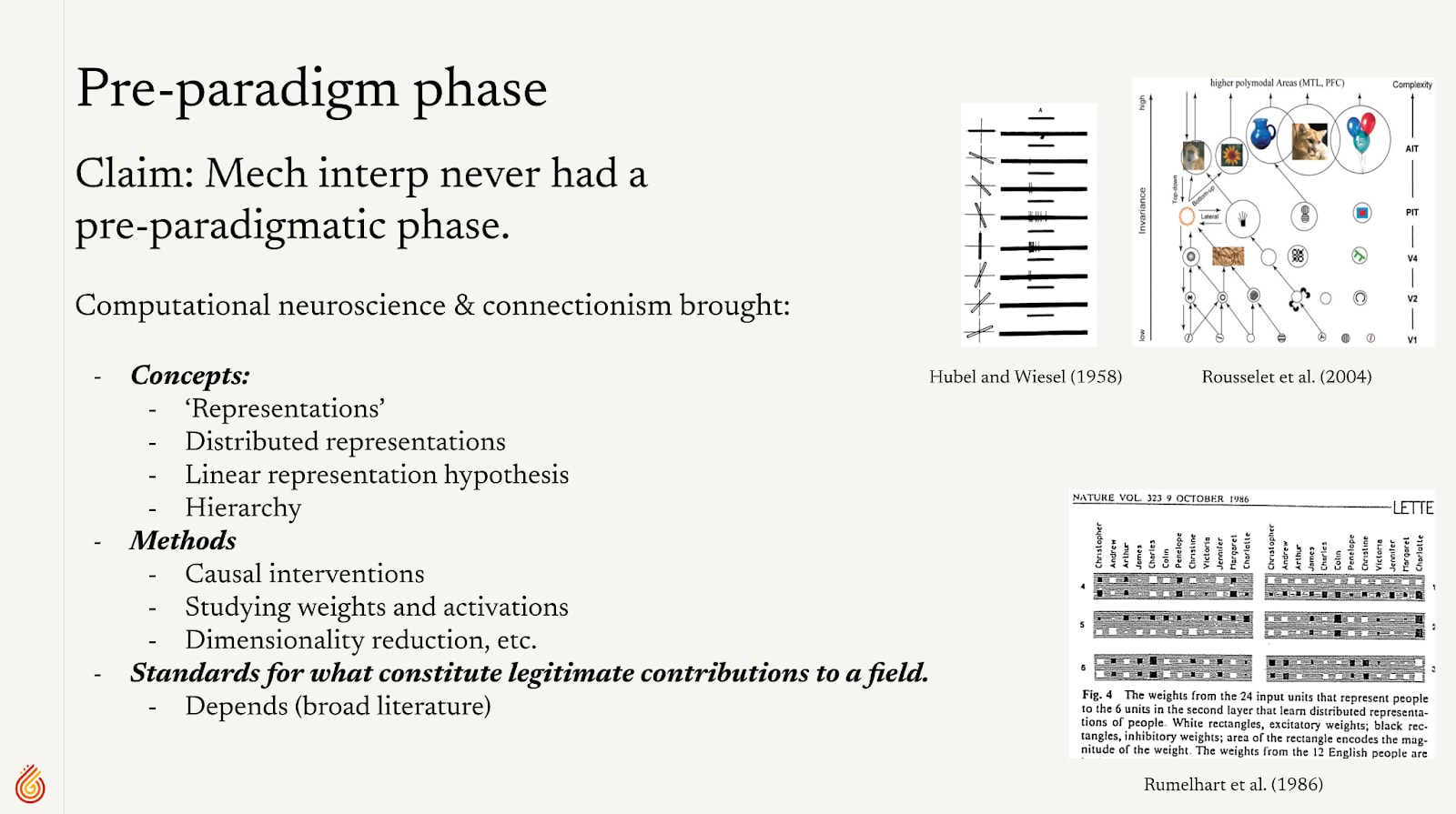 It's important to note that it's pretty subjective whether one views mech interp as a subfield of CNC vs. a subfield of machine learning vs. any other domain. Whether this rings true depends a lot on how one situatuates the field in the context of broader ideas and discussions. I think it's reasonable to disagree with the perspective that mech interp is a field best contextualized within the CNC paradigm. And that perspective matters for whether mech interp should be considered pre-paradigmatic. I argue here that mech interp qua CNC isn't pre-paradigmatic because CNC isn't. But mech interp qua machine learning could very validly be said to be pre-paradigmatic. For instance, it has had to (and continues to) endure various political battles with other parts of ML to establish itself as a legitimate subfield, and establish within the ML community an agreed-upon set of facts, concepts, and practices. I tend to view the field more through the mech interp qua CNC lens. But I take it as a valid and mutually inclusive perspective to view it as a subfield of ML, even though these two perspectives might lead to different conclusions with regard to its pre-paradigmaticity. But I'll proceed using the perspective that mech interp is a subfield of CNC, since that frame feels most natural to me personally given my path to the field.