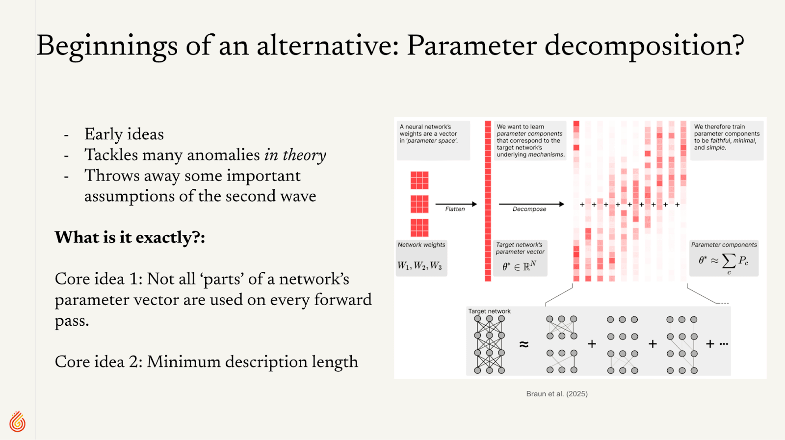 Emphasis here on “in theory”. Current Parameter Decomposition methods are not yet scalable or robust enough to convincingly demonstrate that they can resolve the anomalies of Second-Wave Mech Interp in practice (though we're making progress on this - we'll have another paper out on this soon). But conceptually, the approach suggests a promising path forward for the field.