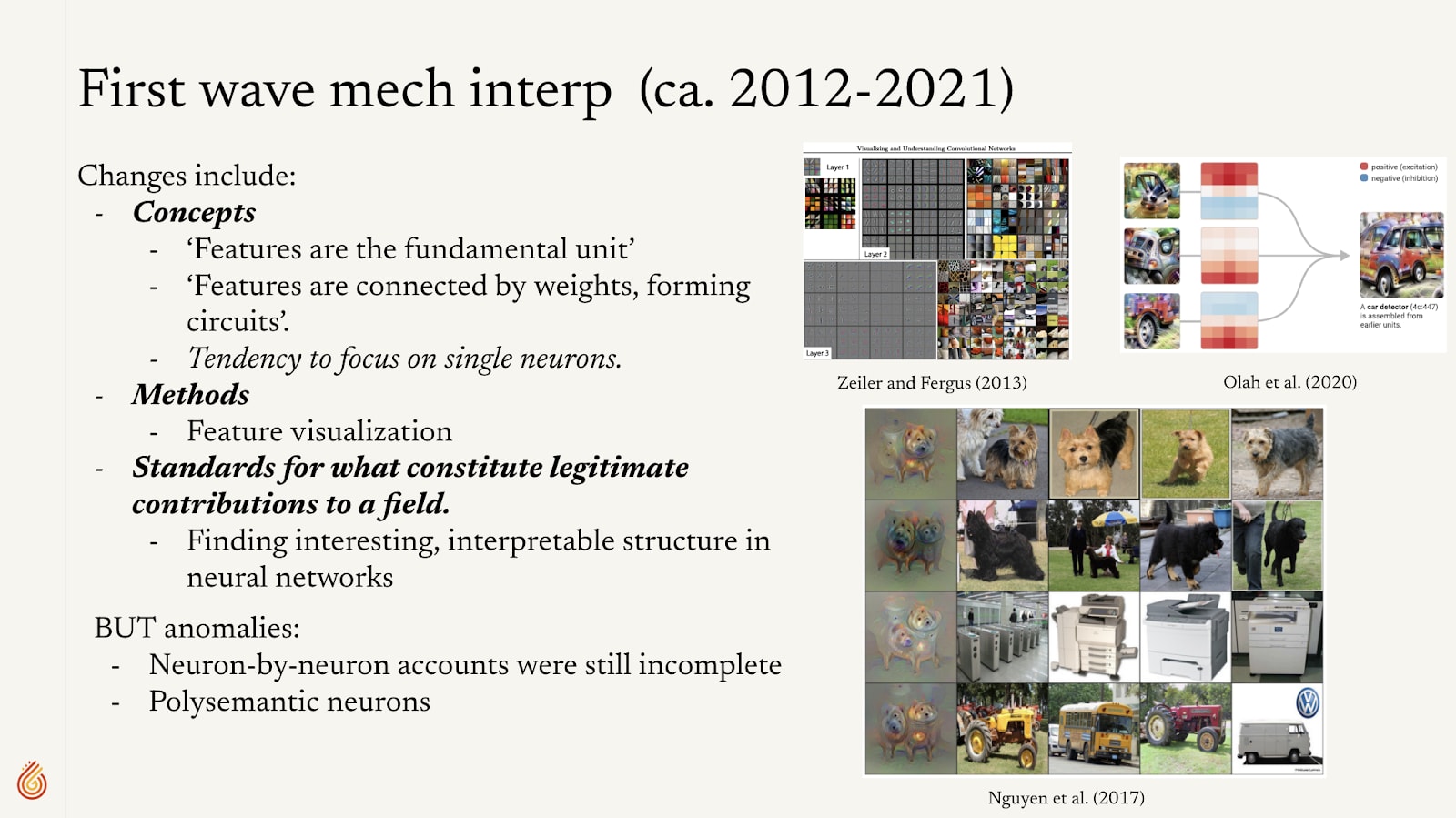 Some of the earliest days of the deep learning revolution were also the earliest days of mech interp, which began with what I call 'First-Wave Mech Interp'.