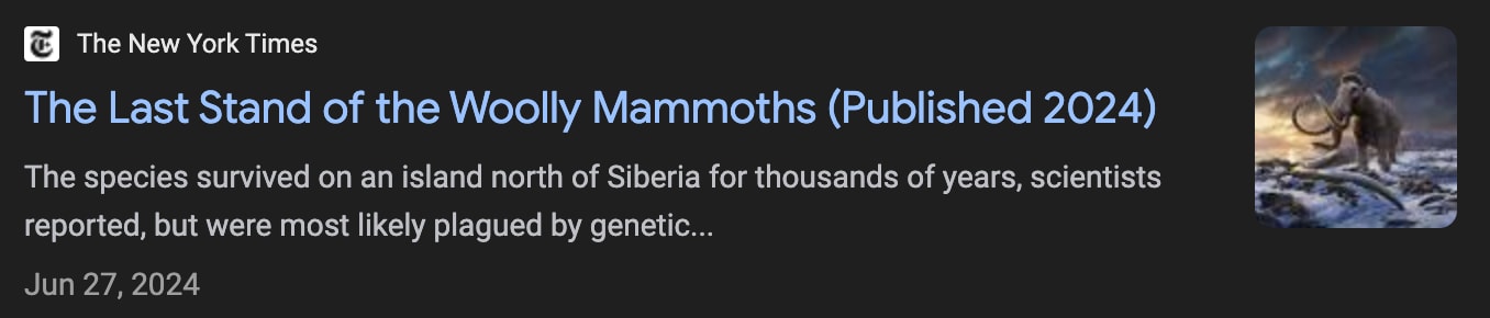 If you search “mammoths Wrangel Island”, you can find results from Science, Live Science, Science News, Sci.News, New Scientist, Advance Science News, Science News Explores, ScienceAlert, IFLScience, FlipScience, SciTechDaily, Technology Networks, and others, for over 100 results when using Google News. The discovery of mammoths on Wrangel Island was actual news: We’d previously thought that mammoths had been extinct for much longer than they had been in reality. So tons of articles got written (or generated, or copied) that ChatGPT got trained on, teaching it that the idea “Mammoths were still alive [longer than believed]!” is, or at least was, a very popular one.