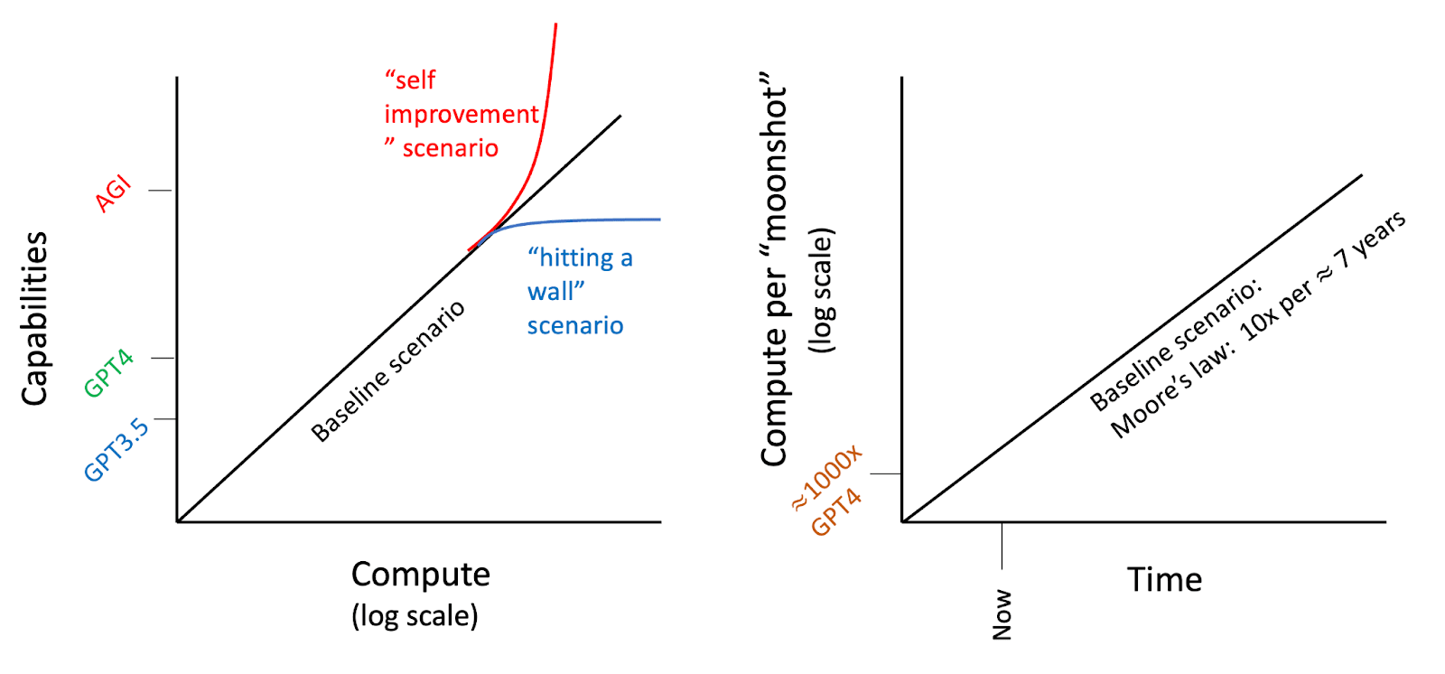 Figure: Left: Cartoon of capabilities of AI systems as a function of computational resources. To a first approximation, historical improvement in capabilities scaled with the logarithm of commute invested. There are scenarios of either “hitting a wall” (e.g., running out of data) or “self improvement” (once we get near AGI, we can start using AIs to design better AIs) that could break this line in one direction or the other. Still, the baseline scenario is a straight line. Right: Cartoon of computational resources available per “moonshot investment” (e.g., hundreds of Billion dollars) as a function of time. We expect the computational resources per dollar to increase exponentially with time, eventually reaching the threshold needed for AGI.