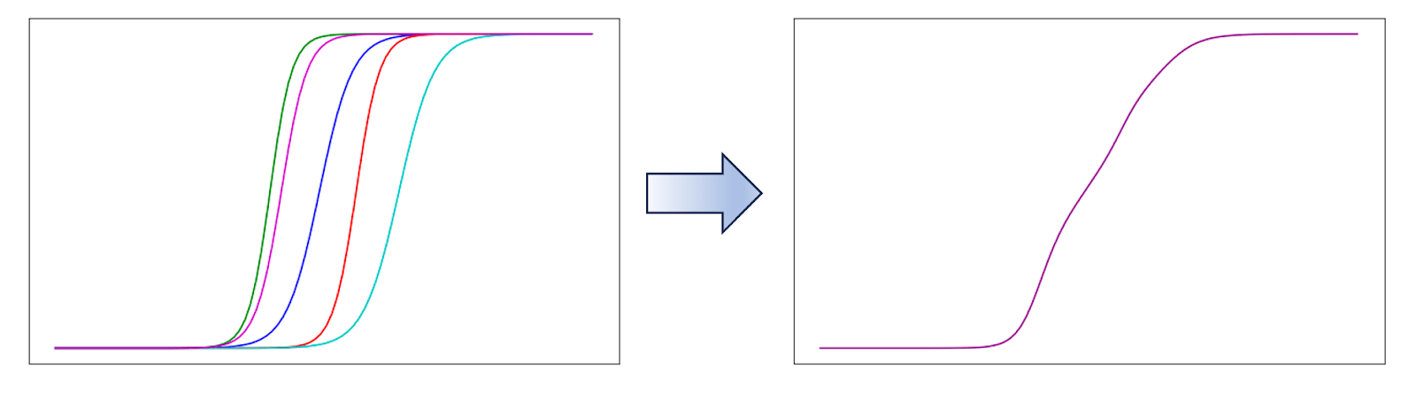 Figure: The right side is the average of the five random sigmoid curves on the left side. If a job involves many capabilities, then even if each capability emerges somewhat rapidly (e.g., within a couple of orders of magnitude), their average “evens out,” so overall performance grows more slowly.