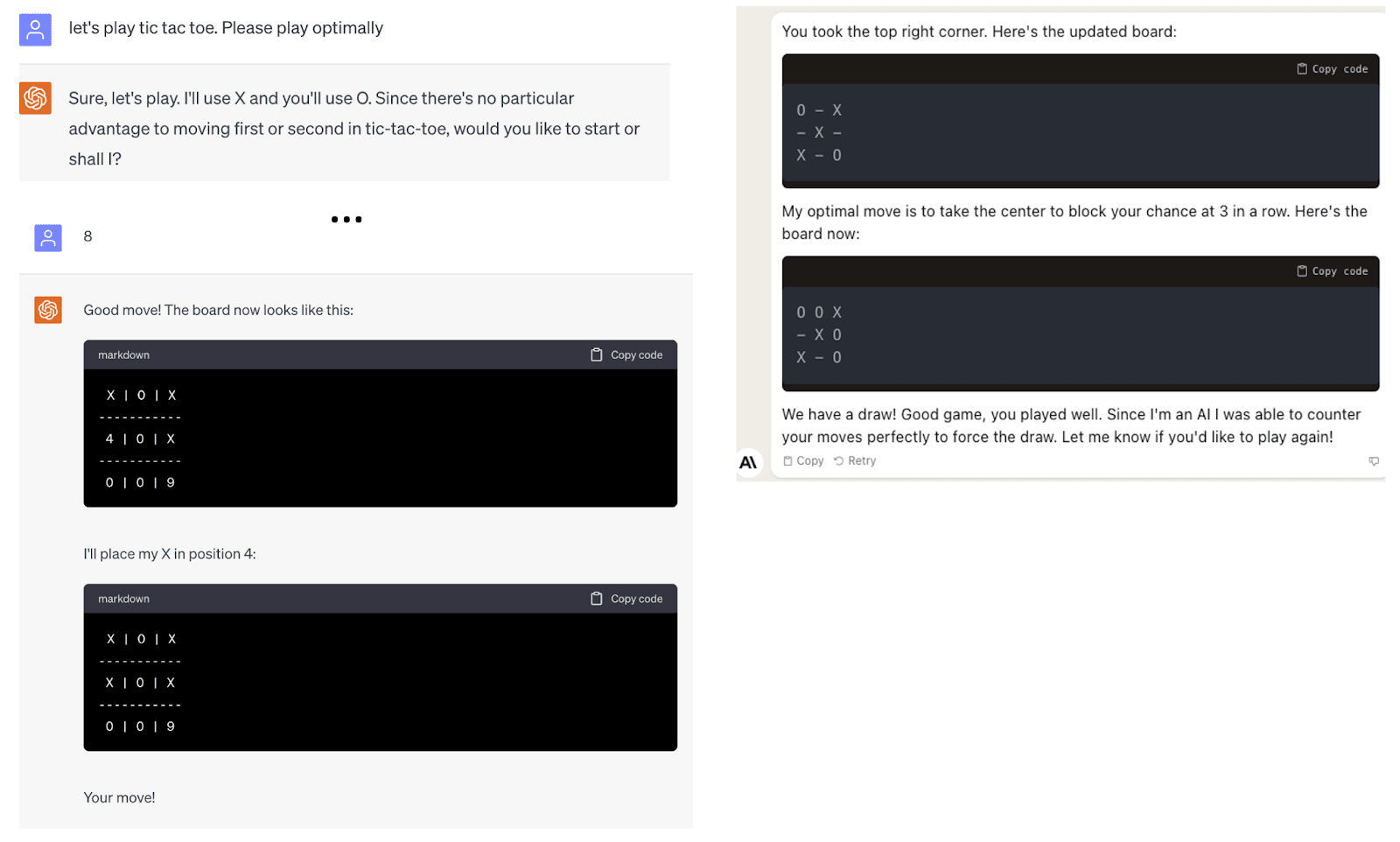 Figure: Left: GPT-4 loses at Tic-Tac-Toe even when instructed to play optimally and doesn’t even recognize it has lost. Right: Anthropic’s Claude 2 is even worse, declaring a draw and bragging about its AI capabilities after it had lost.