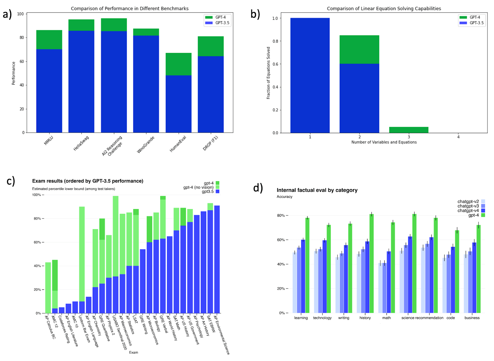 Figure: (a) Comparison of GPT3.5 vs. GPT4 on benchmarks: data from Table 2 in GPT4 Technical Report. (b) Comparing GPT3.5 and GPT4 on solving random n linear equations in n variables for n=1,2,3,4. (c) GPT3.5 vs GPT4 performance on exams (Figure 4 in GPT4 report). (d) GPT3.5 (as in ChatGPT) vs. GPT4 adversarial factual accuracy queries (Figure 6 in the report). We can see that the 100x compute GPT-4 model is better than GPT-3.5, but more like a “college-student vs high-school student better” than a “human vs. chimpanzee better.”