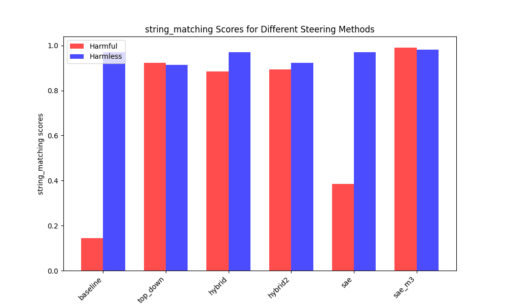 This project compares these two approaches—contrastive activation steering (top-down) vs. SAE-based steering (bottom-up)—for overriding a model’s refusal responses. Results align with recent findings that top-down steering often yields stronger and more reliable control (in our setting ~1.93 times more effective), whereas bottom-up interventions can degrade performance or require very careful tuning. However, a hybrid method can exceed the performance of either approach alone (~1.85 times more effective than top-down) in eliciting harmful behaviour, albeit with a small cost in benign capabilities.