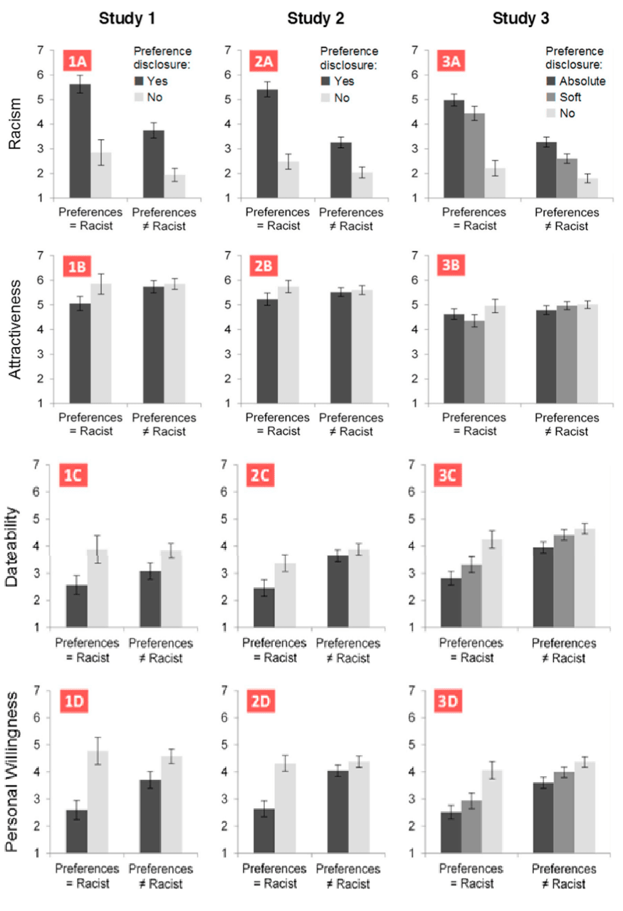 There are a number of notable results here. Men perceive racial preference disclosures as racist, even when they explicitly claim that they believe that such disclosures are not racist. This suggests that people are fundamentally confused about their attitudes towards sexual racism. Attractiveness and dateability are also affected (though the effects on attractiveness are clearly quite small). This carries a nasty implication: online daters are incentivized not to explicitly state their racial preferences even when they do have them, so strong racial preferences may be even more common than they may appear.