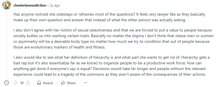 People seem committed this dichotomania. It is very hard to get people to understand that you are merely saying that there are good reasons to go down a particular gradient. I saw a lot of this in online discussions of political philosopher Amia Srinivasan’s book The Right To Sex. When doing her press tour for the book, she gave a short interview in El Pais. Here are the top comments on Reddit’s r/philosophy about this interview: