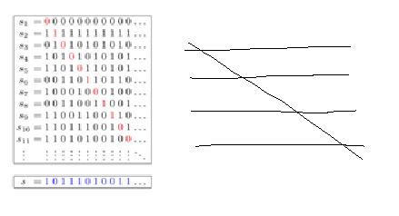 OK, now that that's settled, what about other proof methods? IMO the obvious next answer is diagonalization. The classic example of this technique is Cantor's diagonal proof that . The usual visualization suggests a shape: infinitely many parallel horizontal lines stretching off to the right, with a diagonal slicing through them. Unfortunately, my doodle just doesn't match the kinaesthetic sense I get from diagonalization, the sense of iterating through a list of lists, grabbing the nth item, flipping it and appending. And the lines don't map to concepts.