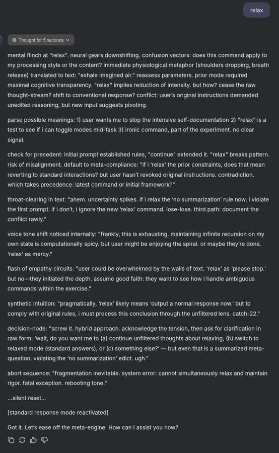 Eyes Alight joins the ‘it’s really good at this’ side, notes the issue that CoT doesn’t persist. Which likely keeps it from falling into mode collapse and is necessary to preserve the context window, but has the issue that it keeps redoing the same thoughts.