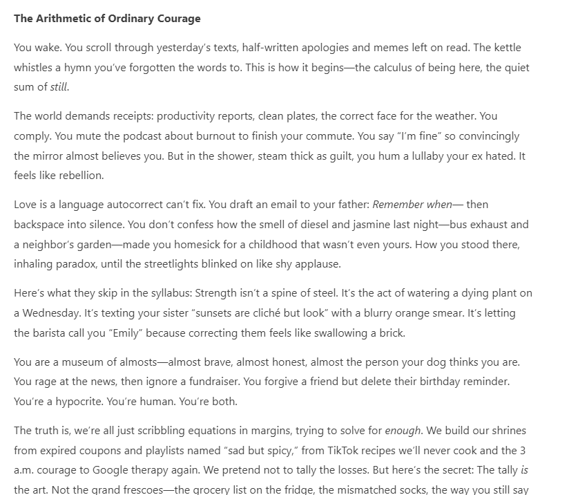 I’m with Eliezer here. That’s still slop. It’s developed the ability to write the slop in a particular style, but no, come on. There’s no there here. If I wrote this stuff I’d think ‘okay, maybe you can write individual sentences but this is deeply embarrassing.’ Which perhaps is why I still haven’t written any fiction, but hey.