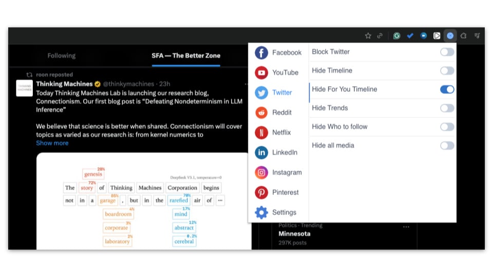 When using X on your desktop browser, disable the For You feed entirely using extensions like Undistracted. You can also create alternative feeds by creating Lists on X and pinning them. Only put high signal-to-noise ratio accounts on these lists.