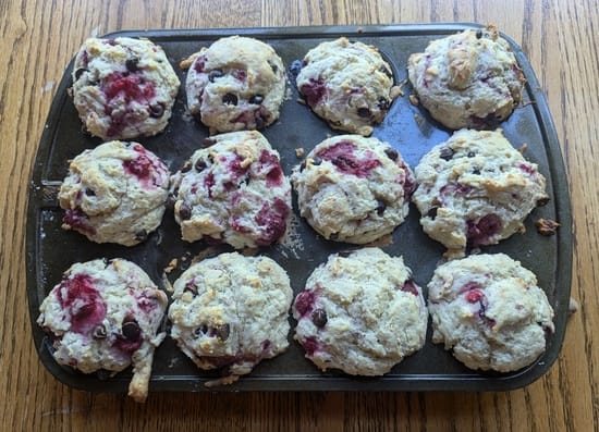 This morning I made raspberry chocolate chip muffins (recipe):