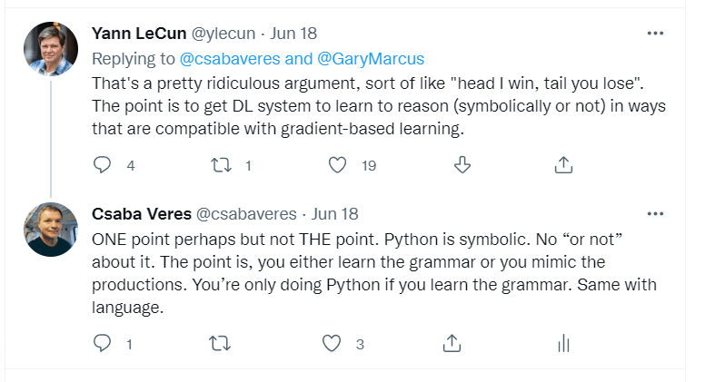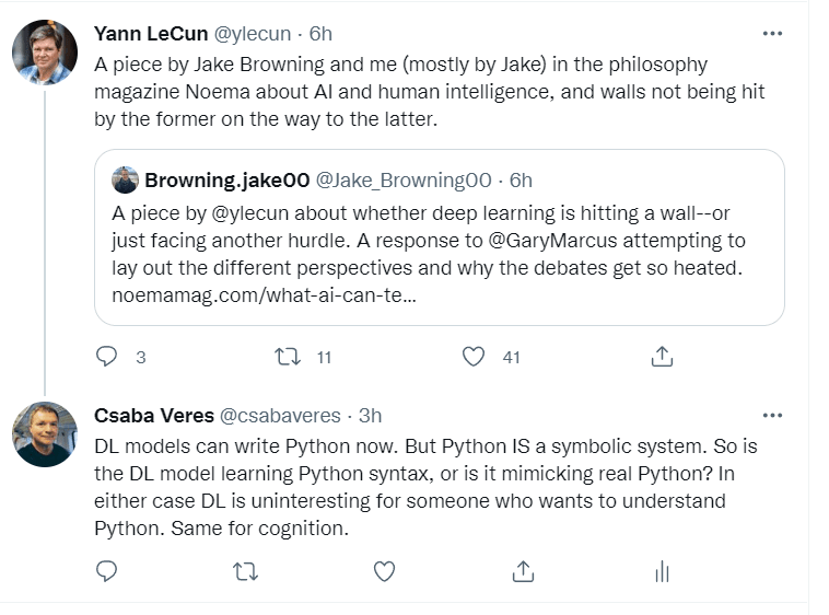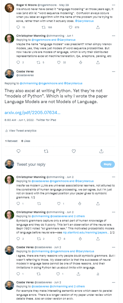 In another discussion with Christopher Manning, an influential NLP researcher at Stanford, I debate the plausibility of DL as models of language. As opposed to LeCun, he actually takes my argument seriously, but drops out when I show that his position is not winnable. That is, the fact that "Language Models" learn Python proves that they are not models of language. (The link to the tweets is https://twitter.com/rogerkmoore/status/1530809220744073216?s=20&t=iT9-8JuylpTGgjPiOoyv2A)