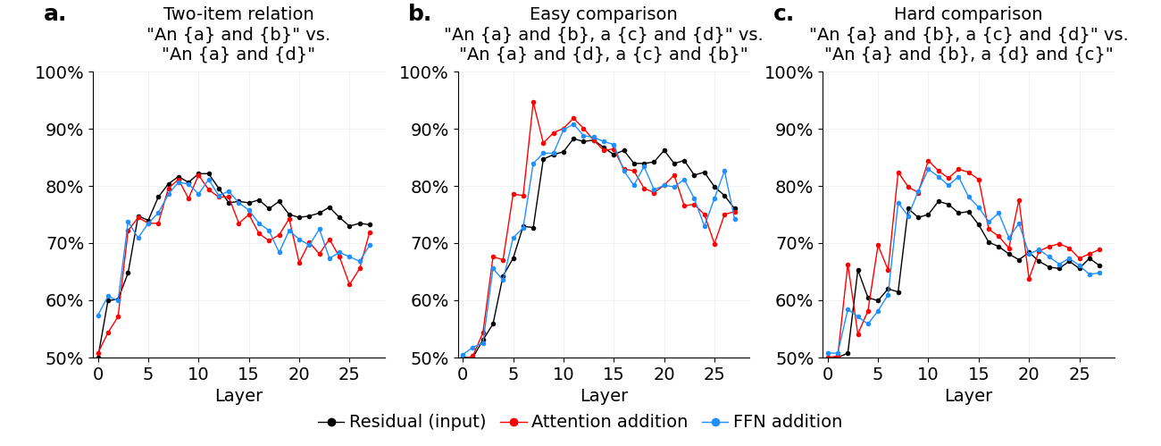 Peak representation of the two-item relational information occurred deeper (layer ~11 peak) than the earlier item-level representation effects. This occurs regardless of how the input texts are defined (Figures 2a & 2b). This is consistent with model layers progressively increasing in abstraction.