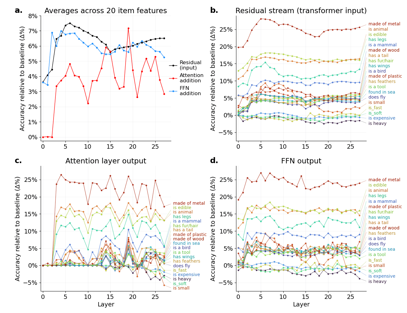 Figure 1. Item-level representation. Accuracies for the binary prediction tests of Experiment 1 on Llama-3.2-3b. A. Achieved accuracies averaged across all twenty item features. B-D. Accuracies achieved for each item feature, plotted separately for the three probed transformer components. Feed-forward network, FFN.