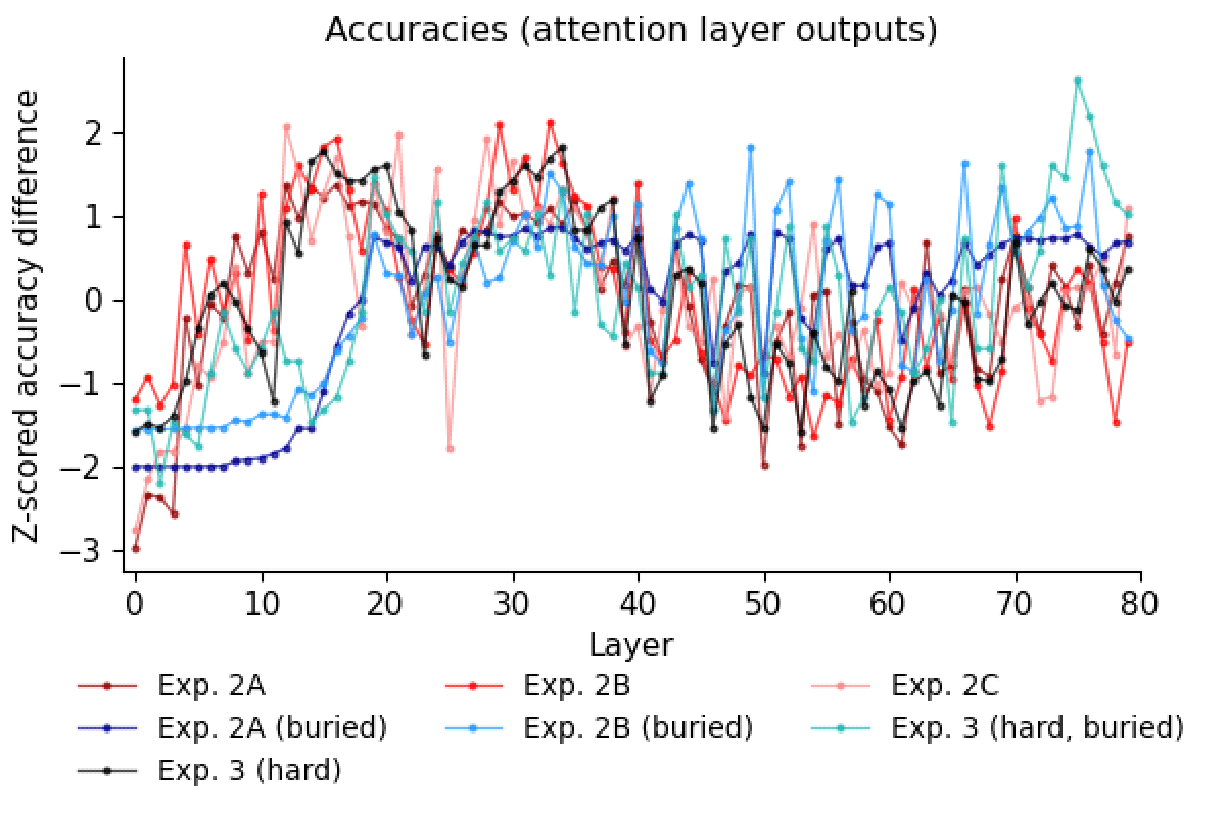 To better understand the dip-valley-dip representational profile, I examined accuracies associated with the attention layer outputs. Compared to the residual stream and the feed-forward network outputs, the attention output representations displayed this double-peak most prominently. I z-scored the accuracies for the seven experiments involving pairs of items of four-item analogies (z-scored across layers for a given experiment) (Figure 6a).