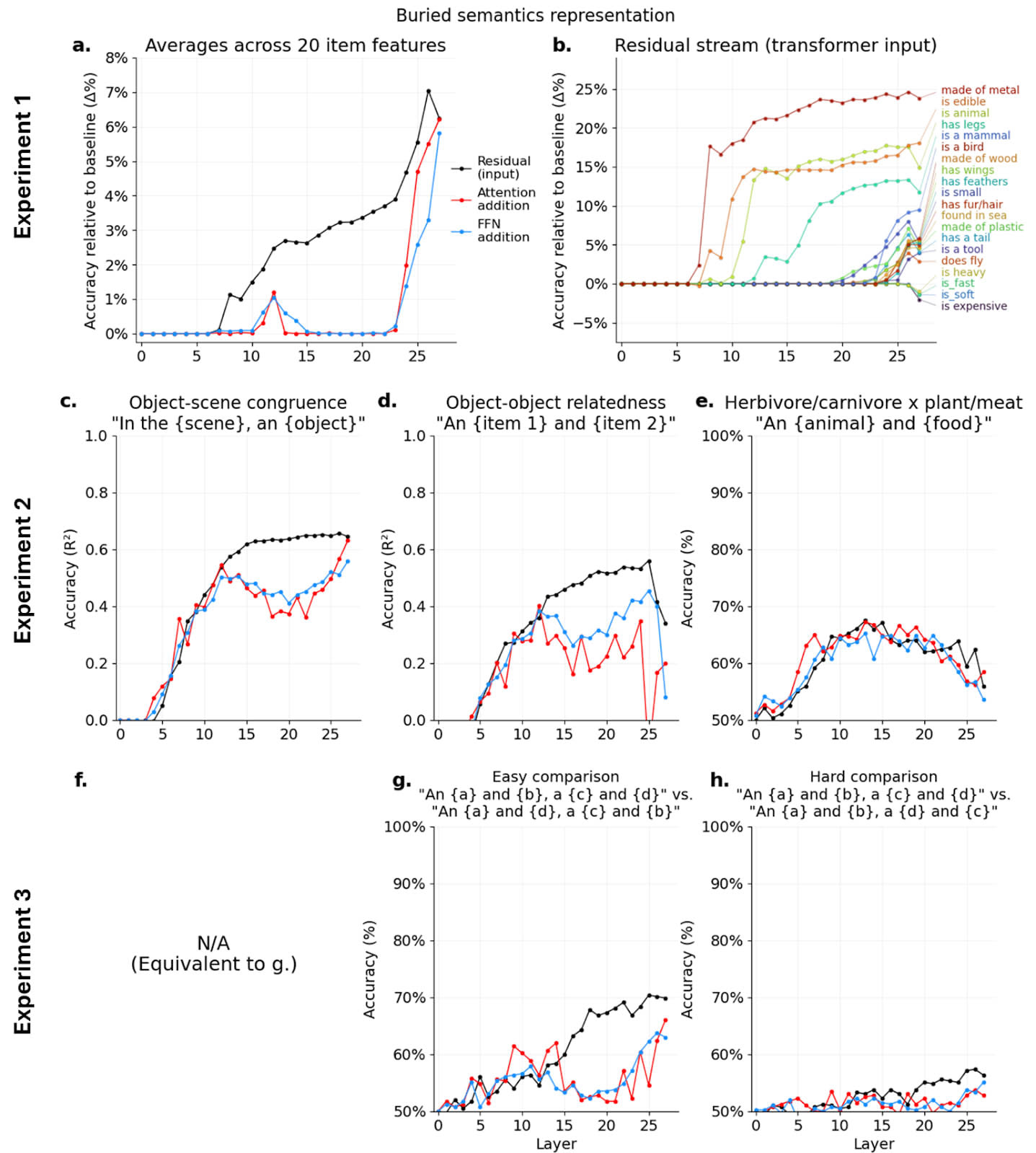 Methods: I submitted very short texts to an LLM and used a probing approach to examine the representations within each layer. For example, I submitted texts like “An apple” and extracted the residual stream activity. Then, I used the activations to fit a support vector machine (SVM) predicting whether the object (apple) contains a given property (e.g., is edible). The layers where the activations produce the most accurate classifier constitute the layers that most represent this item-level semantic property. I applied this general probing approach across several experiments, also studying two-item relations and four-item analogies – aspects of semantic processing less often examined in interpretability research.