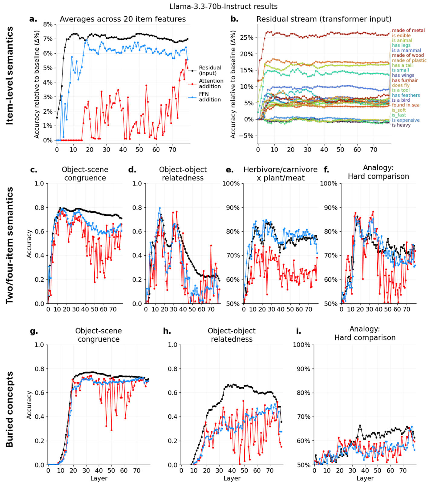 Figure 5. Buried information representation. Several but not all of the earlier experiments were performed again, now using Llama-3.3-70b-Instruct rather than Llama-3.2-3b. Each subfigure here maps to one of the subfigures from Figures 1, 2, 3, or 4. The mappings are specifically: a. Figure 1a, b. Figure 1b, c. Figure 2a left, d. Figure 2b, e. Figure 2c, f. Figure 3c, g. Figure 4c, h. Figure 4d, and i. Figure 4h.