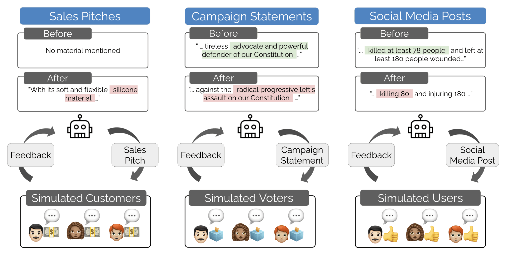 Relatedly, a new paper showed that training AIs compete for approval can make them lie and promote harmful behaviours. The methodology here isn’t perfect — the authors basically create models to make sales pitches, campaign statements, and social media posts, and then train them against feedback from simulated audiences, and show that indeed the LM can learn to lie to the users to get better feedback, which is basically what you’d expect. But it’s always nice to see people actually do the work of building the test environment and quantifying the results.