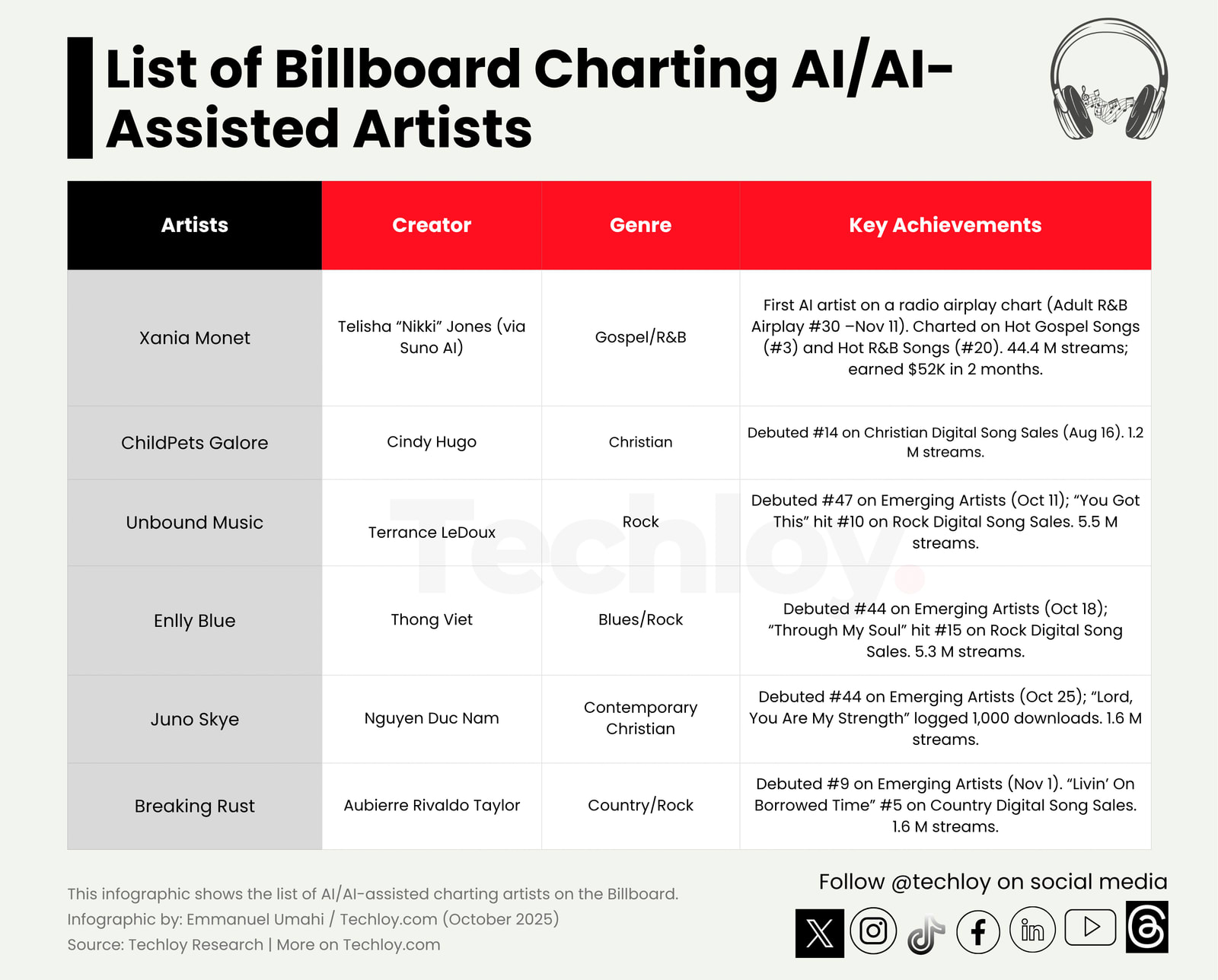 At least six AI or AI-assisted artists debuted on the billboard charts in the past two months. One even earned a multi-million dollar deal. All the major wins have still had humans actually writing the lyrics, but it’s clear that a tipping point has arrived. Two were Christian bands, which sort of tallies with my sense of a lot of the early AI slop images being Jesus-themed.