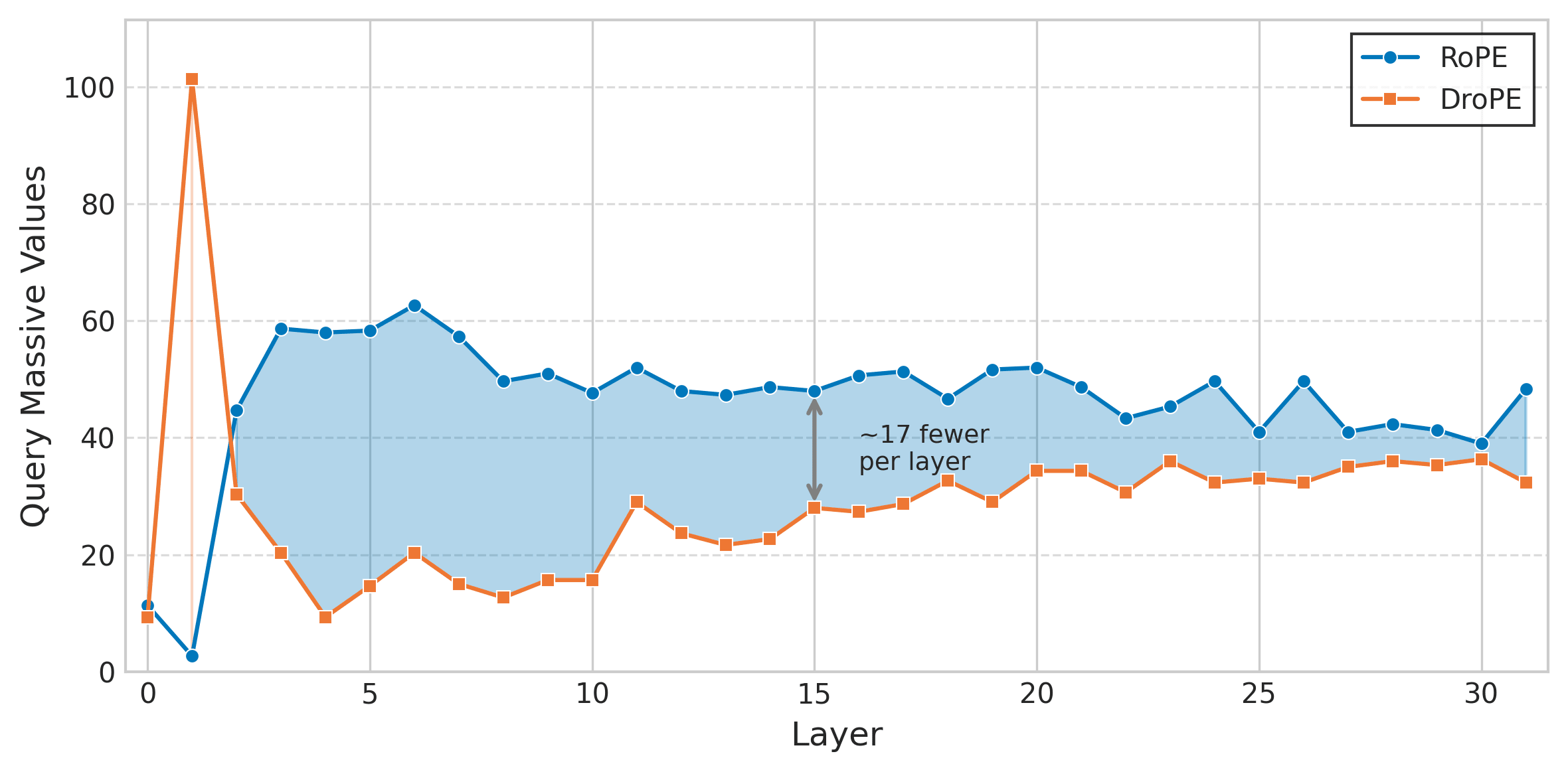 Figure 2: Query massive values by layer. The shaded area shows the reduction from RoPE to DroPE. DroPE consistently has ~17 fewer massive values per layer.
