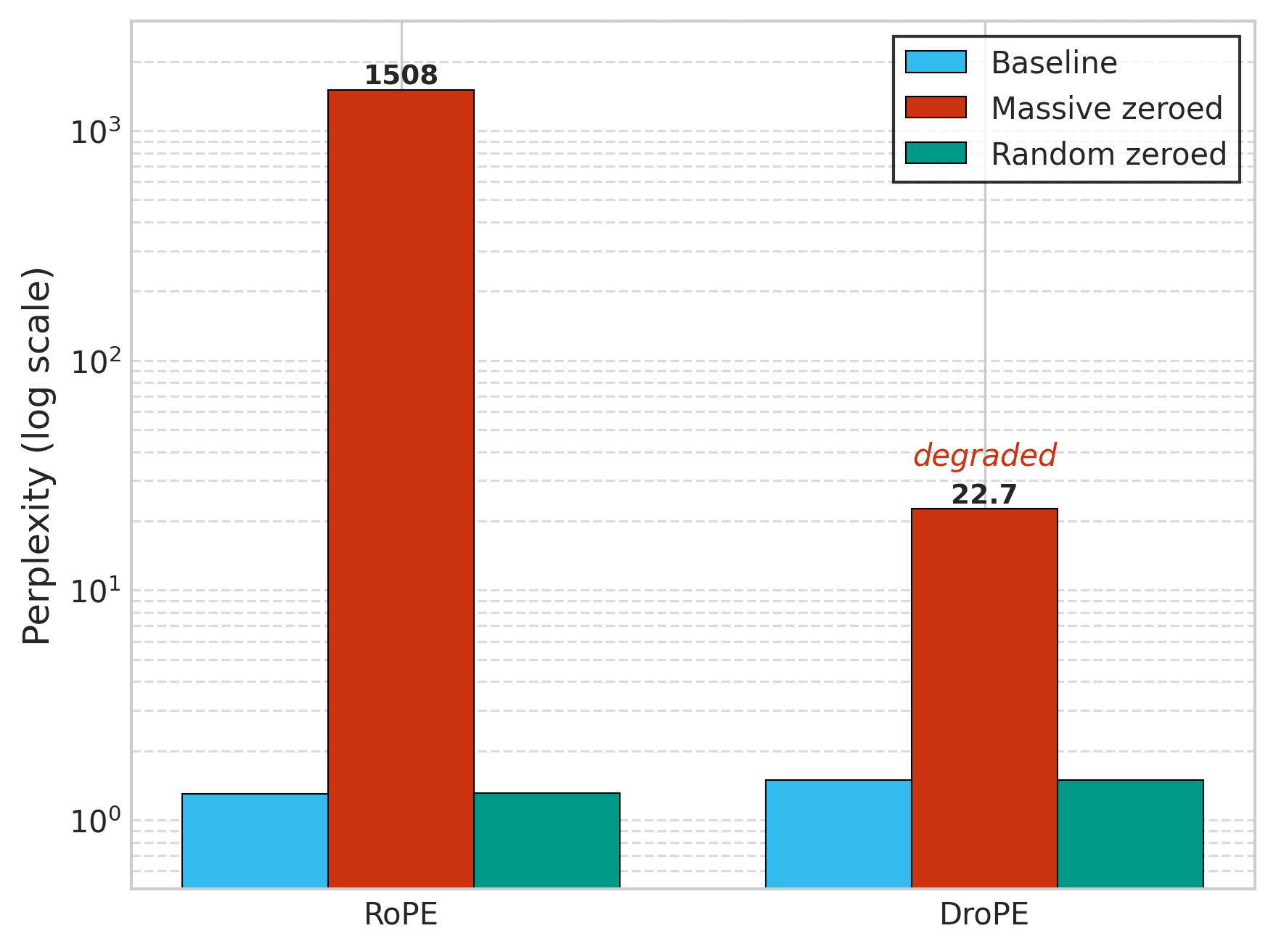 Figure 4: Perplexity after disruption (log scale). Zeroing massive values breaks RoPE (PPL 1 -> 1508) but only degrades DroPE (PPL 1.5 -> 23). Random controls cause negligible damage.