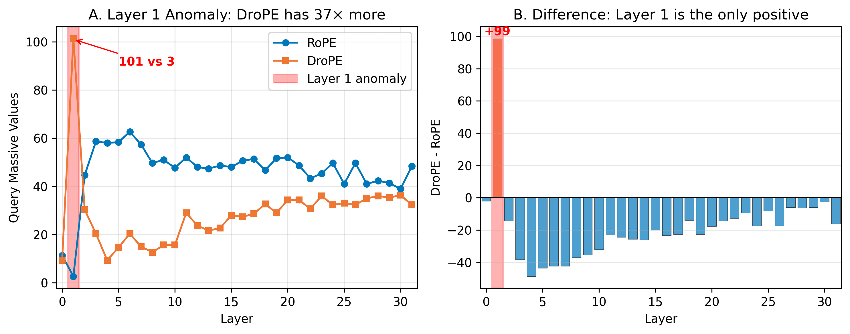 Figure 3: Layer 1 is the only layer where DroPE has MORE massive values than RoPE. This suggests DroPE concentrates some position-independent processing in the first layer.