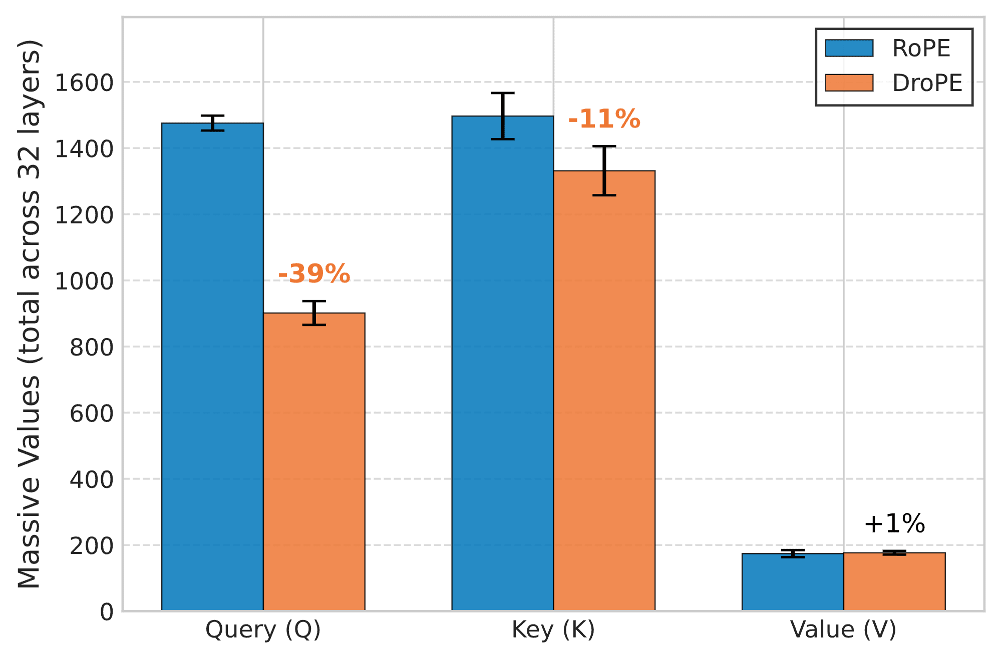 Figure 1: Massive value counts for Query, Key, and Value tensors. Error bars show ±1 standard deviation across 10 text samples. DroPE shows 39% reduction in Query and 11% reduction in Key.