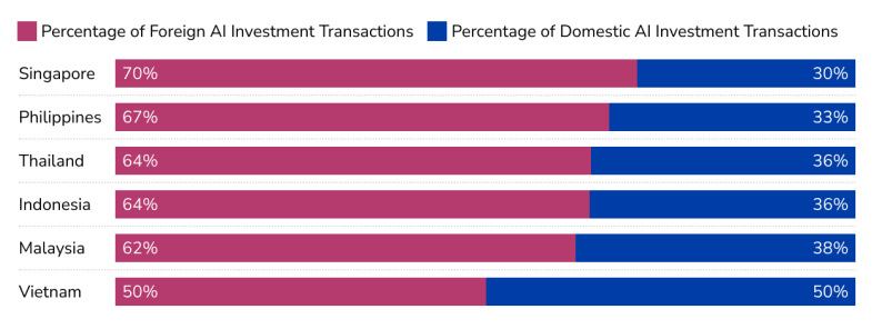 Fig. 2: Share of Domestic and Foreign Investments in AI Companies in Singapore, the Philippines, Thailand, Indonesia, Malaysia, and Vietnam (2010–2021) (Luong, Lee, and Konaev 2023).