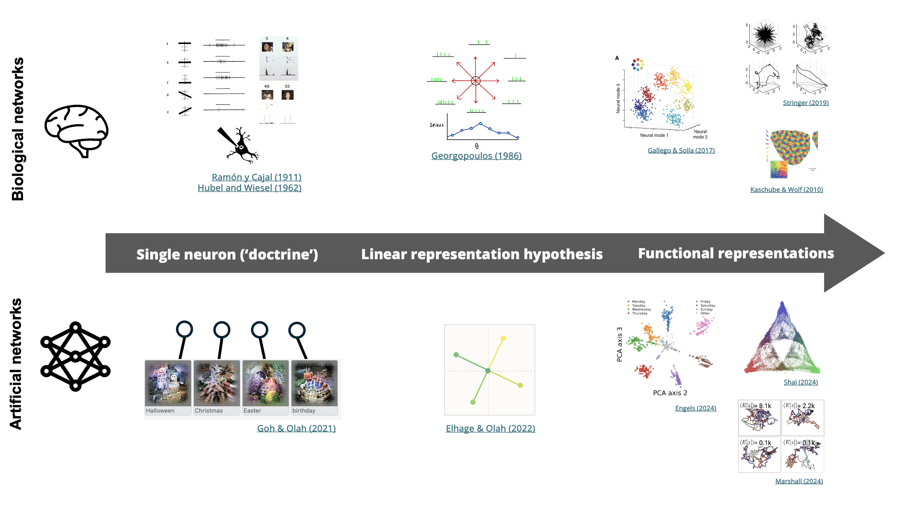 Towards a Unified Interpretability for Neural Networks. Bridging the structure of representations to their function constitutes the frontier of interpretability research for both biological and artificial networks. To approach it, both fields have developed powerful methods, including manifold geometry, statistical physics, topology, nonlinear decoding, and causal probing. This distributed knowledge is a powerful resource to leverage for both fields.