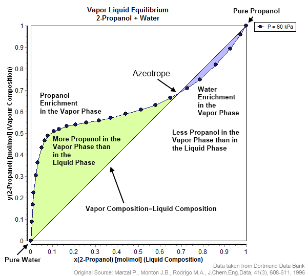 [N.B.: This chart is for propanol rather than ethanol, but it's more nicely labeled than the ethanol charts I could find, and also the relevant regions end up a little more visually distinct here. But it's the same qualitative story as with ethanol, just with more of the action in the [0.95,1] regime. See here for a real ethanol graph.]