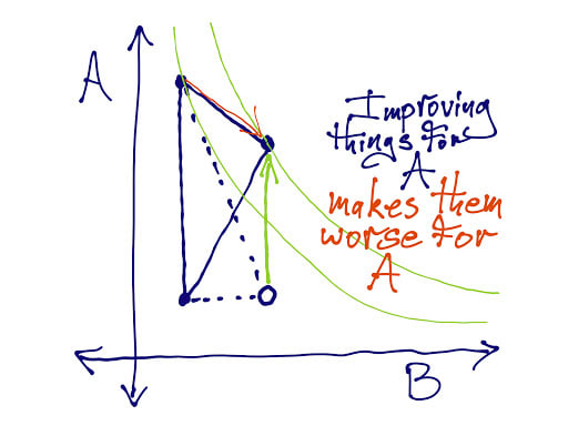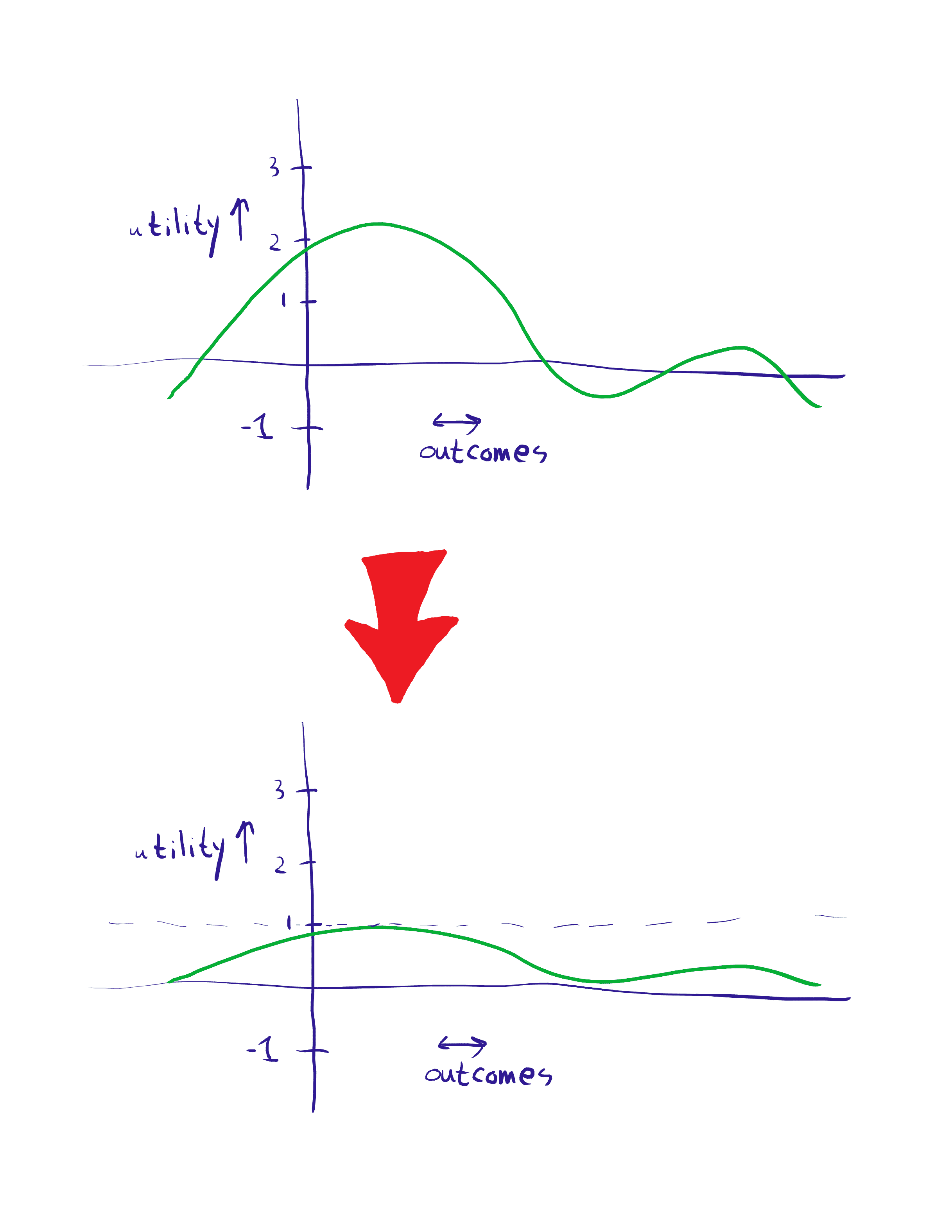 Anyway, so much for normalization techniques. These techniques ignore the broader context. They attempt to be fair and even-handed in the way we choose the multiplicative and additive constants. But we could also explicitly try to be fair and even-handed in the way we choose between Pareto-optimal outcomes, as with this next technique.