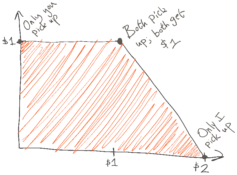 Obviously in the real world we just both pick up our dollars. But, let's suppose we bargain about it, just for fun.