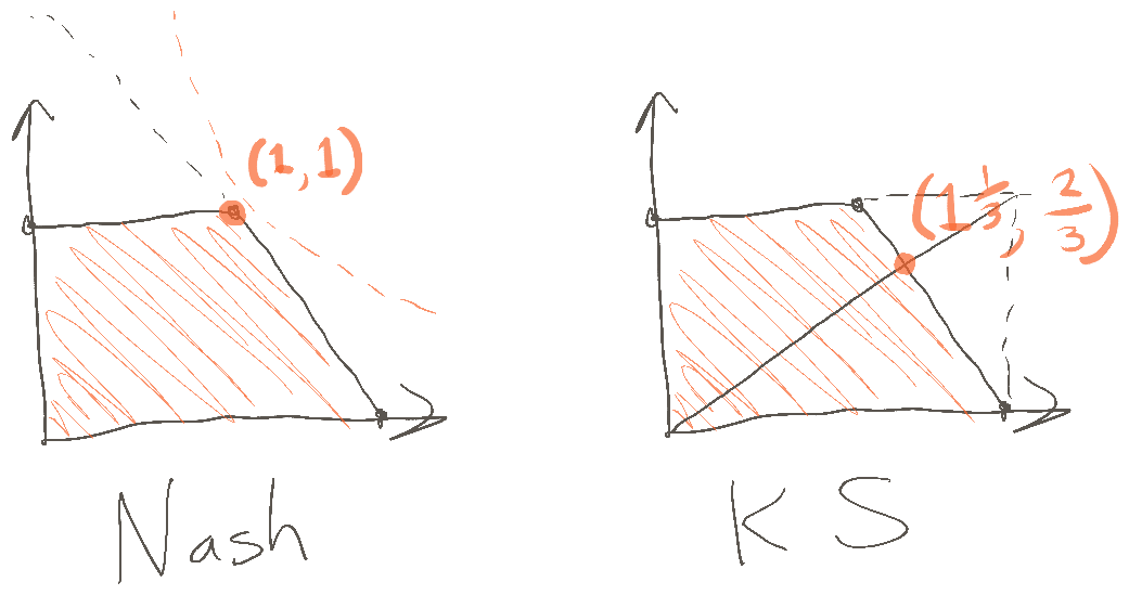 Although the Nash bargaining solution is the most famous, there are other proposed solutions to Nash's bargaining problem. I want to mention just one more, Kalai-Smorodinsky (I'll call it KS).
