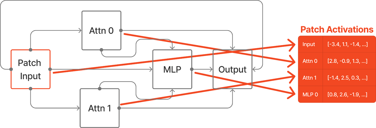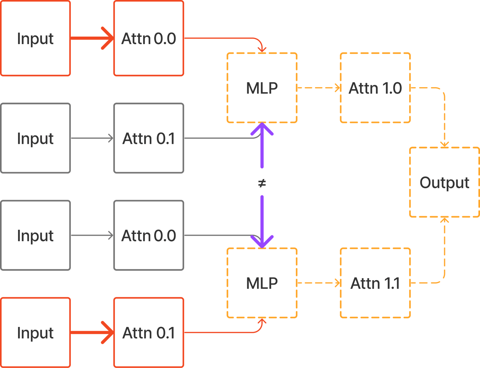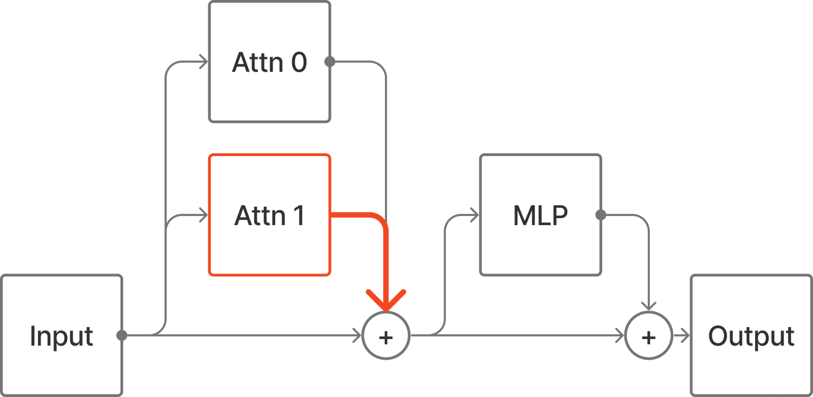 Attn 1when the model is given someinput 1with the output of the head when the model is given some otherinput 2.We will use the running example of a tiny, 1-layer transformer, but this approach generalizes to any transformer and any residual network.